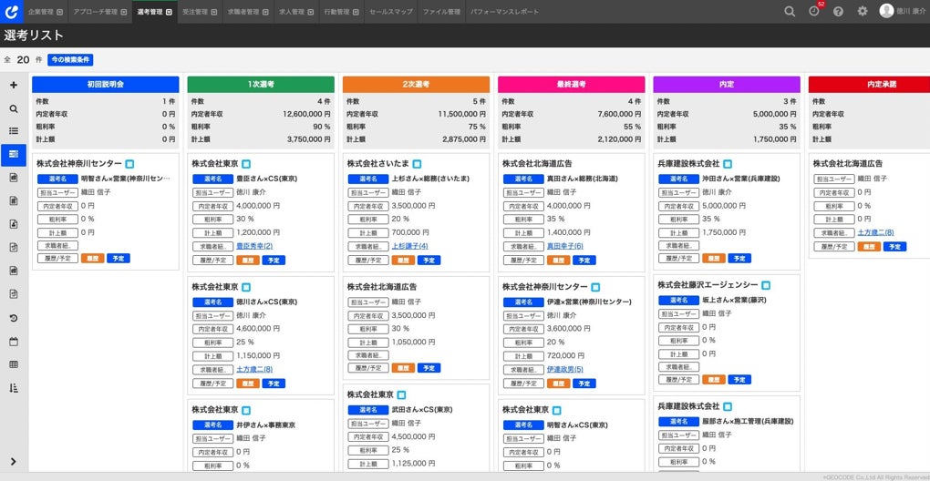 「説明会参加」「一次面接」「最終面接」「内定」「内定承諾」「入社」など、選考過程をフェーズとすることで選考状況を管理できる画面。選考登録時に、企業と求職者を紐づけて登録することで、どの企業の求人に誰が応募していて、今どういう選考状況なのかが一覧化できる。