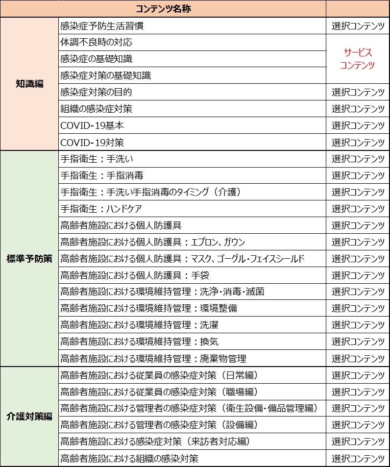 コンテンツは知識編、標準予防策、介護対策編の3種類・約30コンテンツを用意。