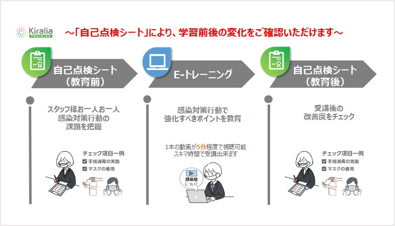 キラリアハイジーン株式会社(以下「キラリアハイジーン」)提供の手軽さとコストを両立した介護業種向けの感染予防に特化した教育プログラム。自己点検シートとe-トレーニングの2つのプログラムで、日常での感染予防行動の振り返りを行った後に、苦手な部分の知識習得向上を推奨コンテンツなどで学び、再度自己点検シートを受けることで、定着を確認できる。
