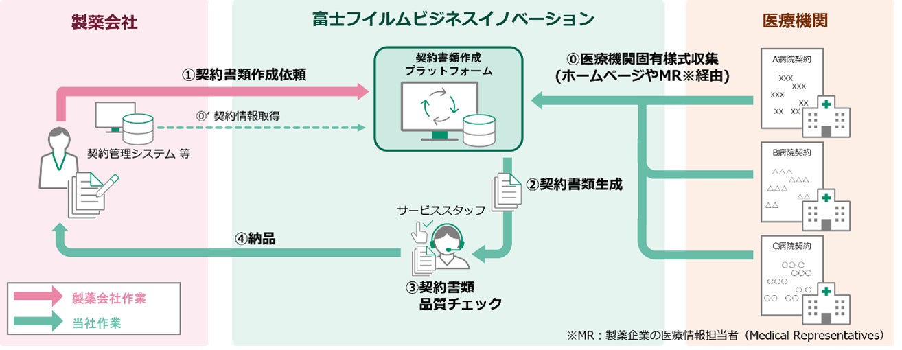 今回提供を開始する「製造販売後調査 契約支援サービス」は、富士フイルムビジネスイノベーションの契約書類作成プラットフォームを活用したもので、必要となる情報が記入済の契約書類を富士フイルムビジネスイノベーションのスタッフがチェックしたうえで、製薬企業に納品するサービス。