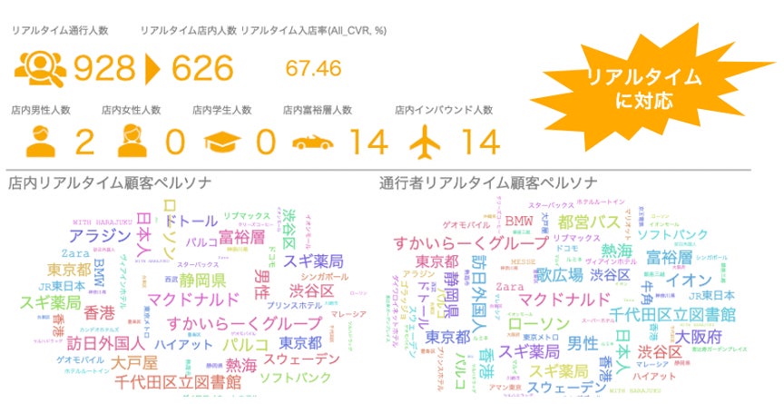 コンテンツの自動出し分け設定に応じた効果測定や人数ボリュームの変化、初回/再訪問、滞在時間、入店率など店舗マーケティングに必須の多彩な情報をリアルタイムに参照できるほか、2次元コードの場合「通行人数→入店人数→視聴可能人数→スキャン回数(→オンラインへ)」というようなファネル情報を得ることができ、単に送客をするだけではない「売り上げアップにつながるオフライン店舗マーケティング」が実現できる。